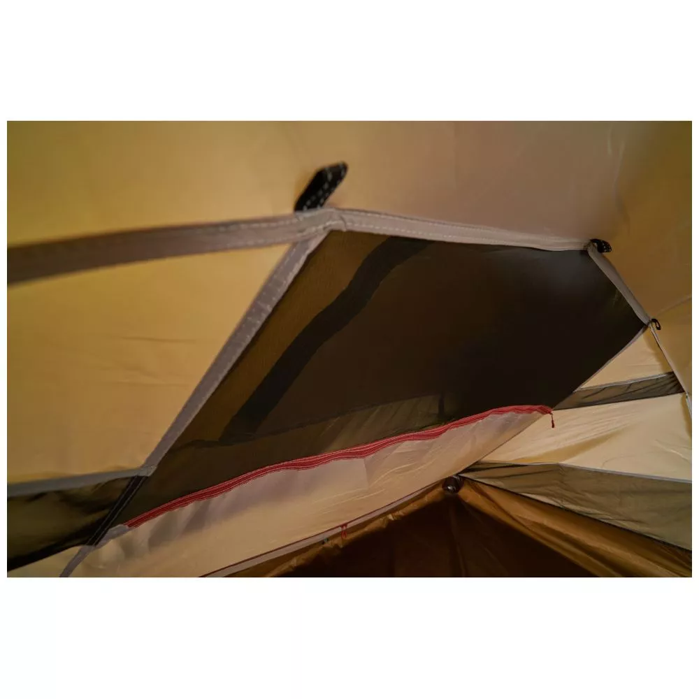 Durch die hohen Eingänge kannst du das Zelt problemlos mit Gepäck beladen betreten und verlassen. Zusätzlich bieten die grossen Eingänge von innen einen besseren Blick in die Natur. Die gesamte Vorderseite kann aufgeklappt werden, um einen 180° Blick nach draussen zu haben.