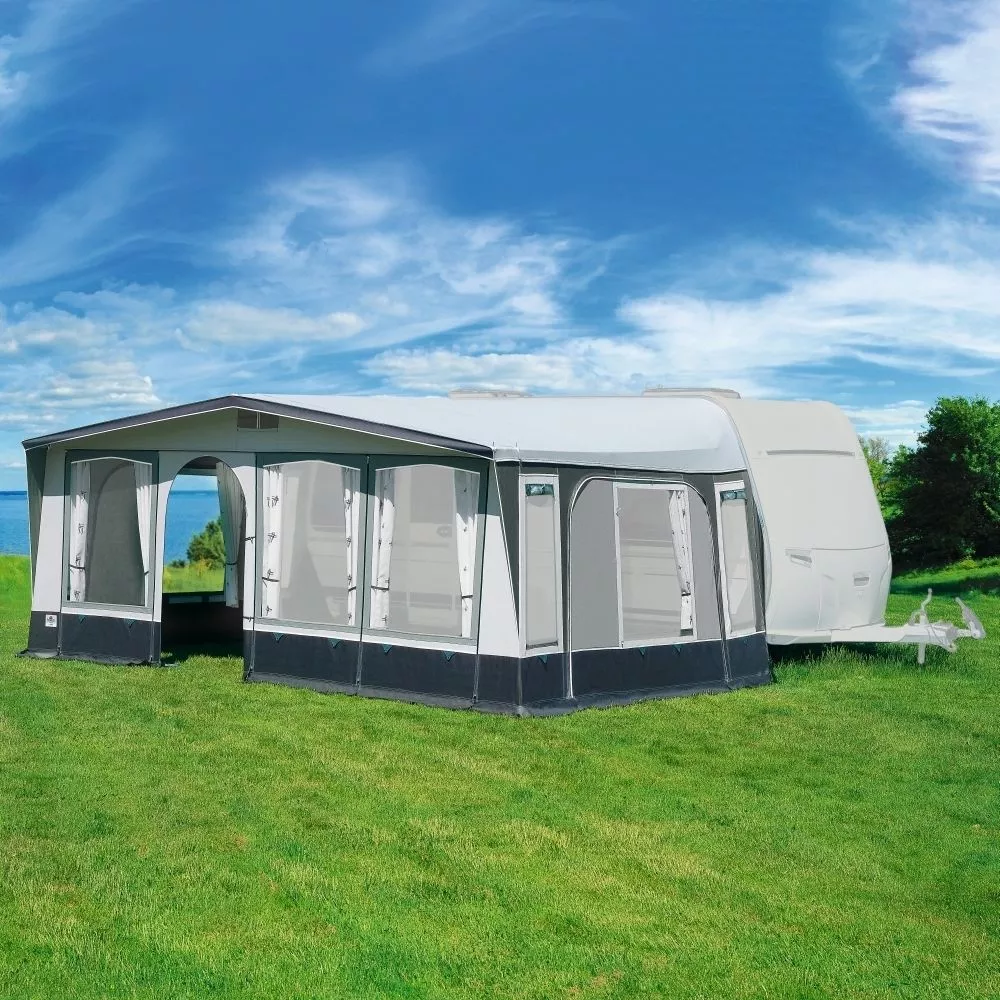 Dieses Caravanvorzelt ist bei Bedarf optional mit einem Vorzelt-Sonnendach erweiterbar. Damit schaffst du dir einen Schattenplatz und kannst deine Sitzgruppe ins Freie verlagern. Oder du benötigst weitere Schlafplätze oder Stauraum? Dann ist der als Zubehör erhältliche Erker bzw. Seitenanbau die Lösung.