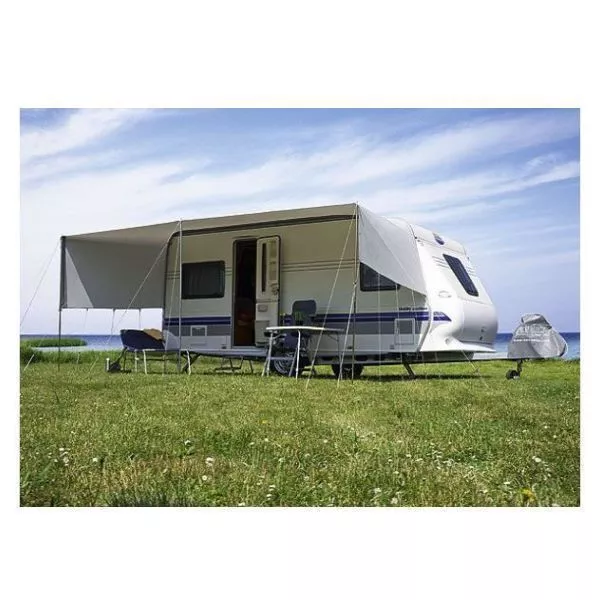 Wenn das nicht praktisch ist: Das ultraleichte Sonnendach dwt Tour Plus mit integriertem Windschutz können Sie sowohl längsseitig am Caravan einziehen, als auch rechts bzw. links – je nach Stand der Sonne und Windrichtung. Angenommen, der Wind oder die Sonneneinstrahlung kommen von rechts – ziehen Sie das Sonnendach Tour Plus nach rechts. Das Sonnendach reicht auf dieser Seiten dann bis zum Boden.