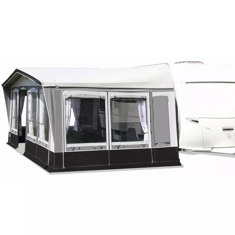 Beim Premium-Vorzelt brand Palazzo 240 kommt für das Dach und die Seitenwände ein robustes PVC-Material zum Einsatz. Die Vorderwand wird aus atmungsaktivem Ten Cate – Gewebe gefertigt. Verschliessbare Fensterklappen, Erdstreifen aussen und innen, Wetterschutzabdeckung der Reissverschlüsse, 3-fach-Seitenfenster, Gardinen und ein robustes 32 mm Stahlrohrgestänge und Vordachverstärkung vervollständigen die umfangreiche Serienausstattung. Das Design ist elegant und zeitlos. Ein ideales Wohnwagenvorzelt für alle Ganzjahrescamper.